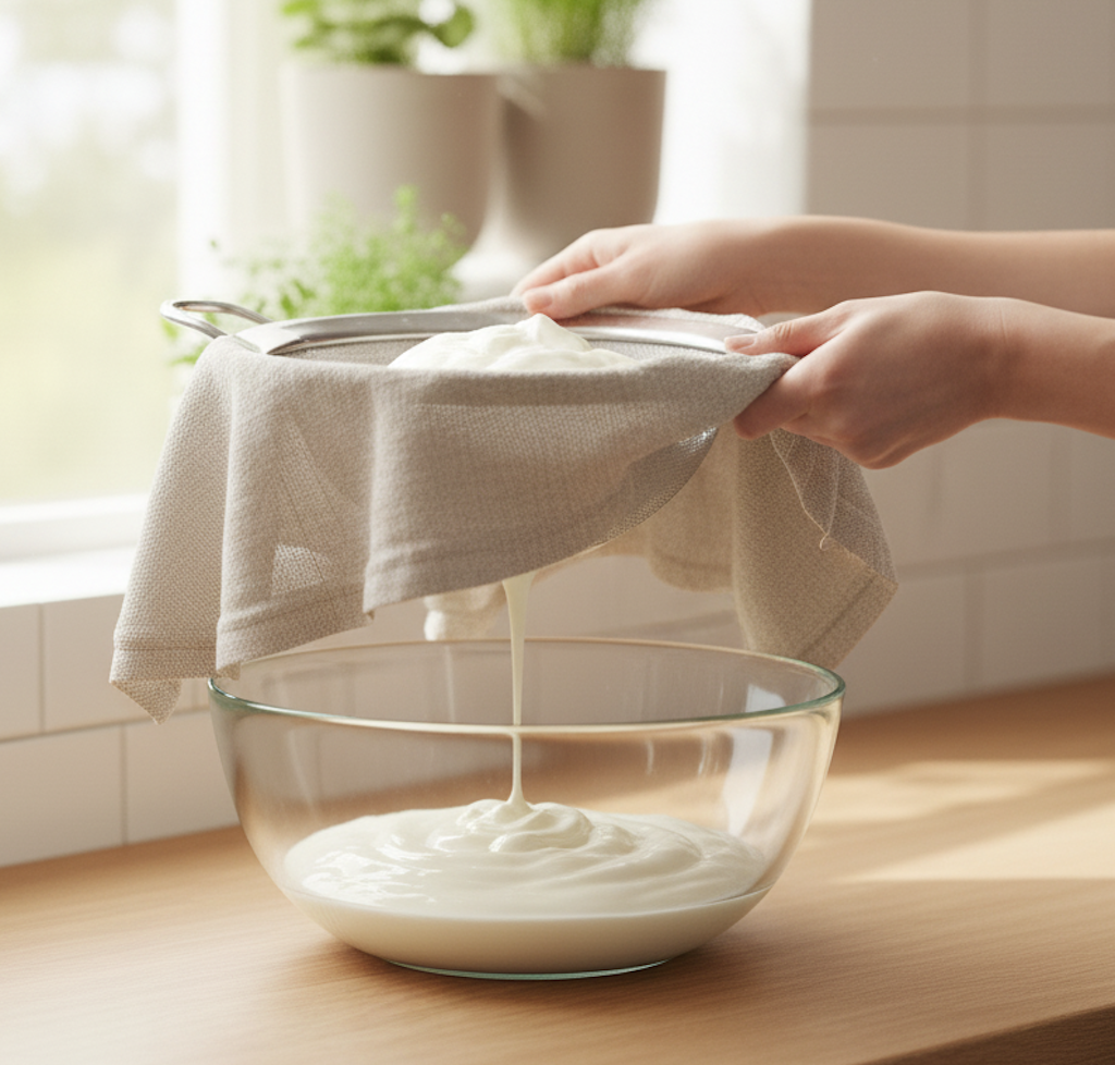 - Strain the yogurt: Line a strainer with cheesecloth, place it over a bowl, and pour the yogurt mixture in. Let it strain in the fridge for 2–4 hours, depending on how thick you want it.