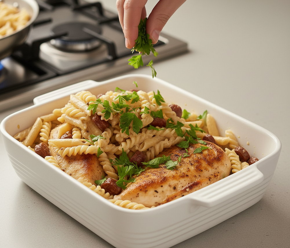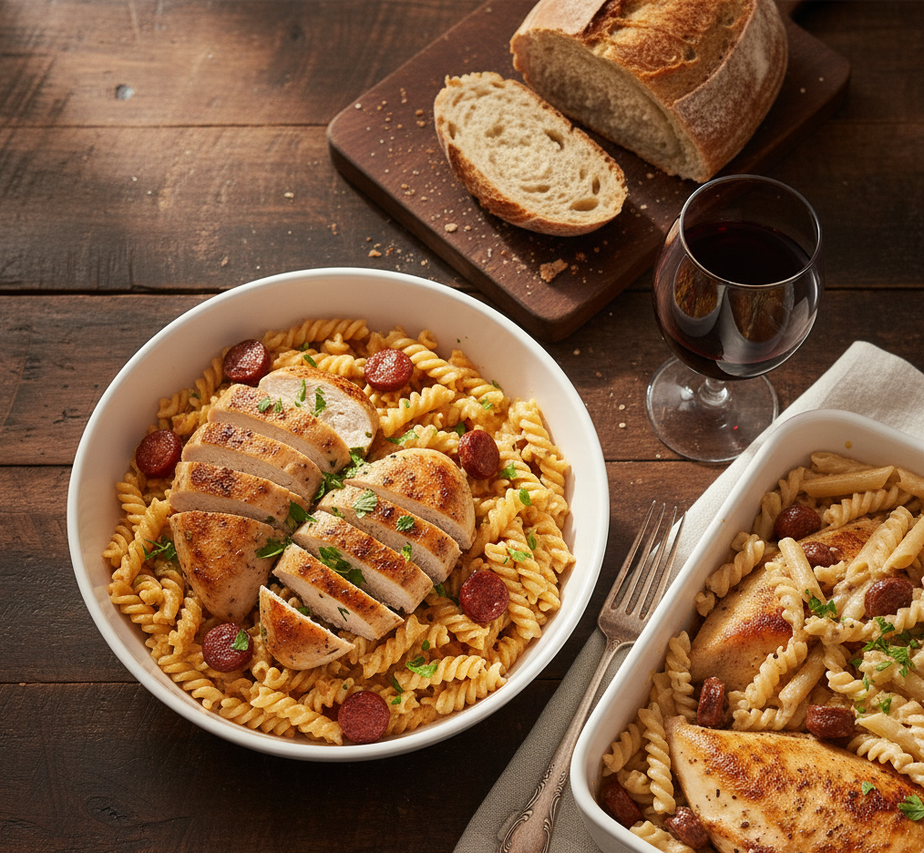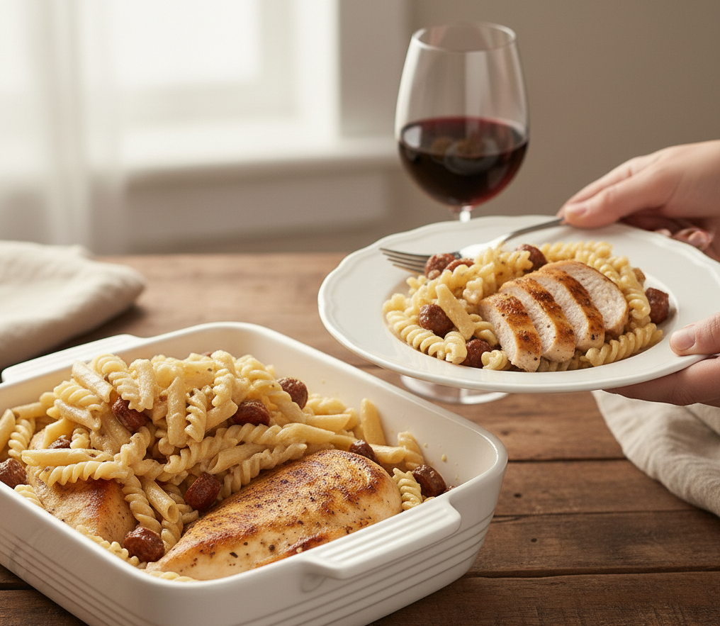 - Optional: Layer the pasta and sauce in a baking dish for a chicken and chorizo pasta bake.