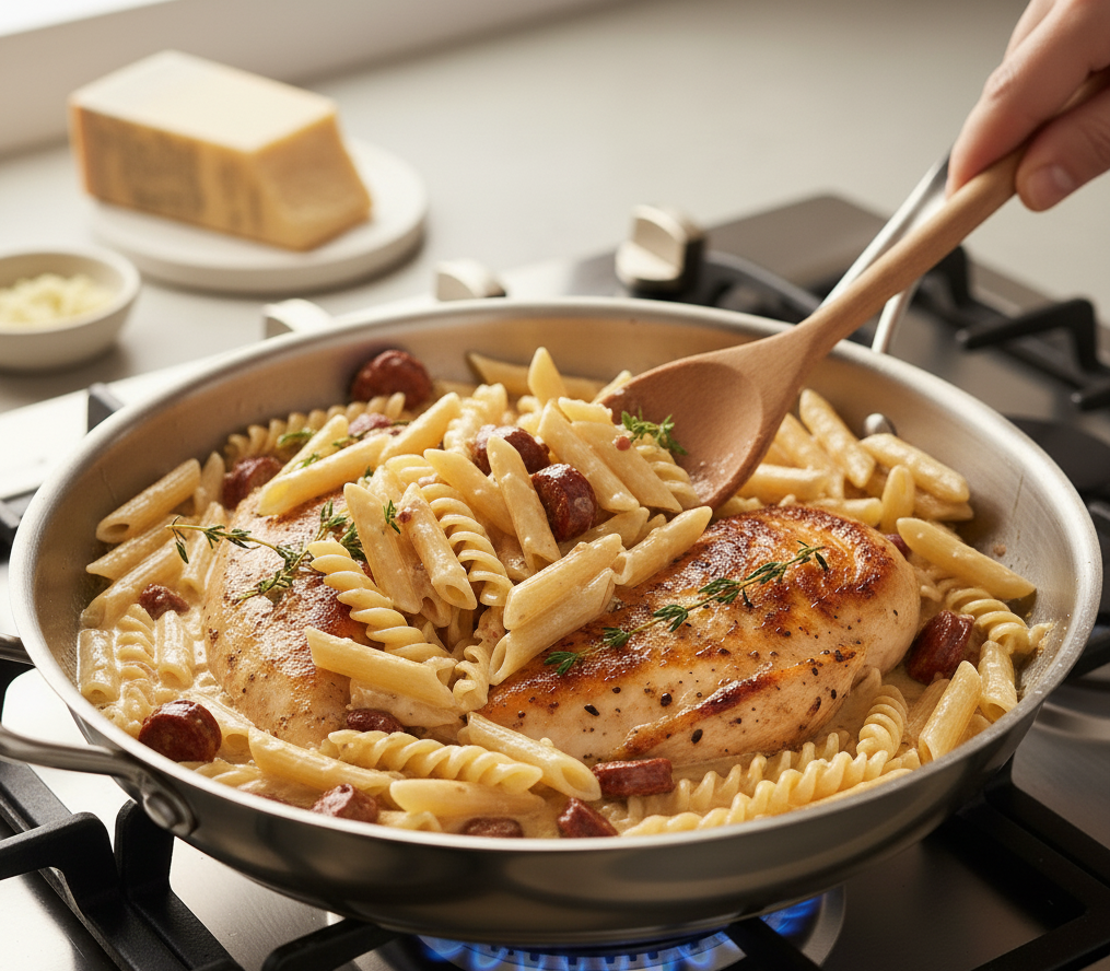 - Serve immediately and enjoy a comforting chicken and chorizo pasta dishes experience.
