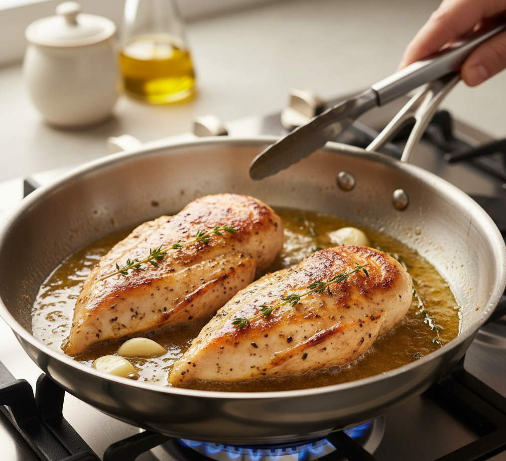 - Sear chicken breasts in butter over medium heat until golden and fully cooked.