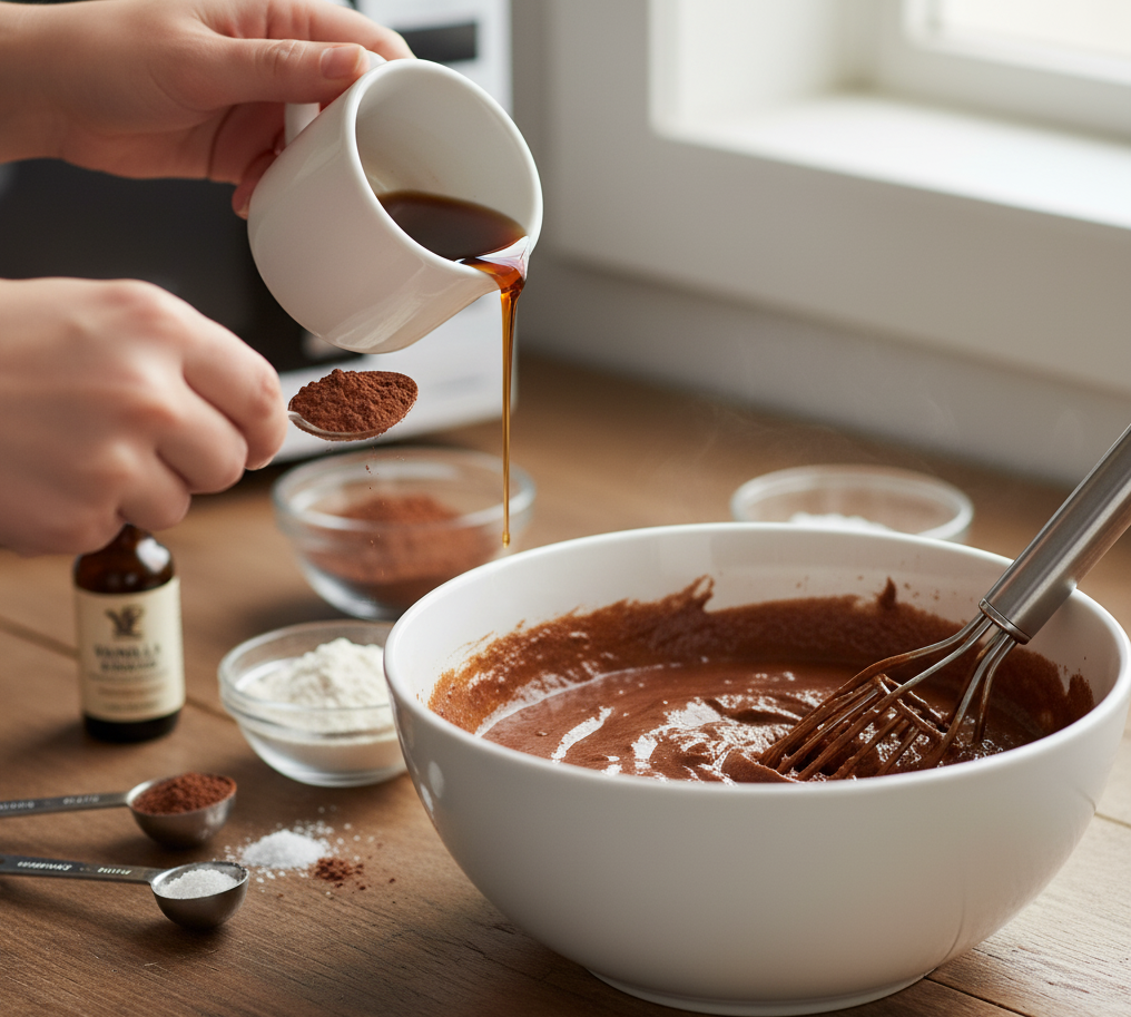 - In a large mixing bowl, combine the mashed sweet potatoes, almond flour, cocoa powder, maple syrup, melted coconut oil, vanilla extract, baking powder, and salt until a thick, uniform batter forms.