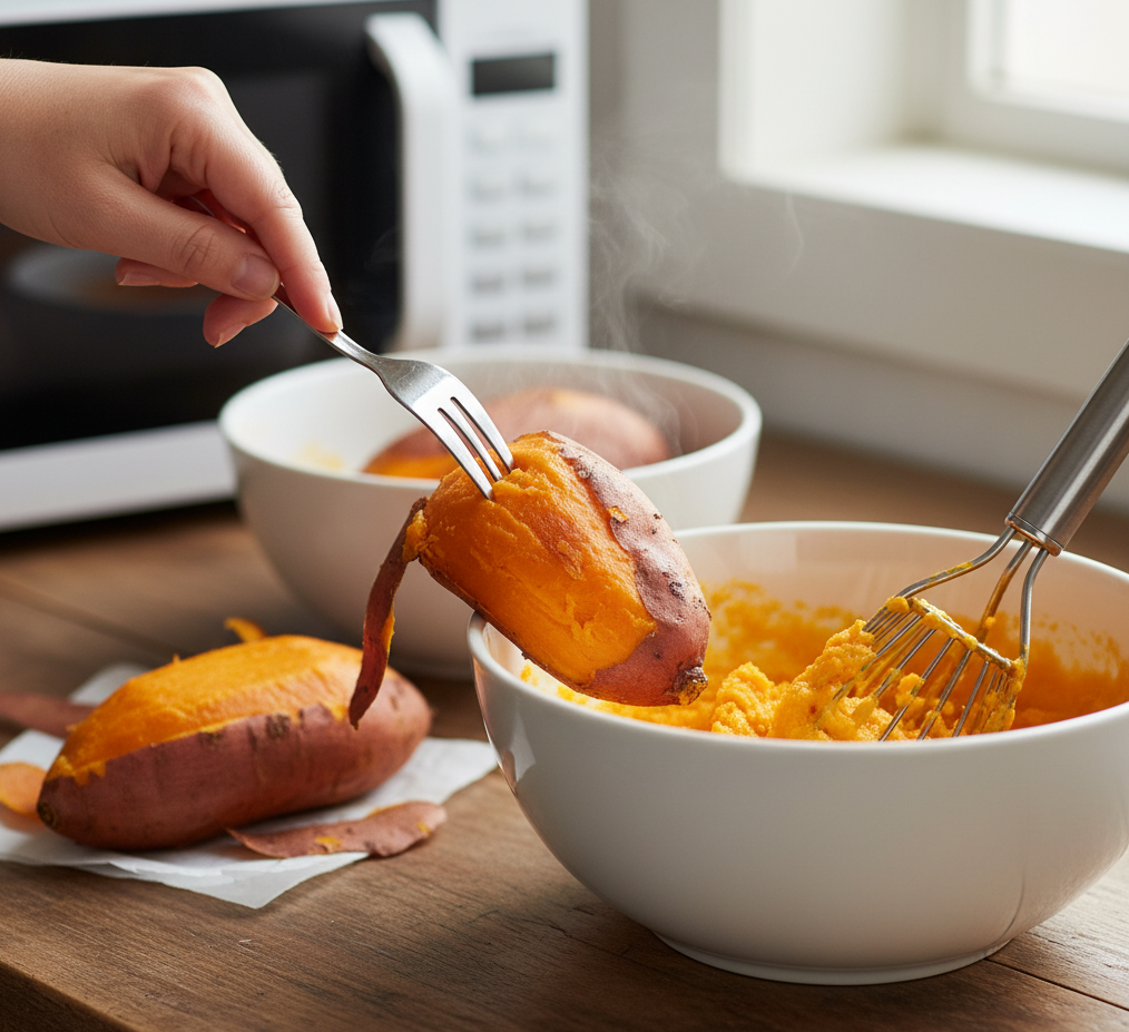 - Pierce the sweet potatoes with a fork and microwave or roast until soft (about 8–10 minutes). Peel and mash them until smooth.