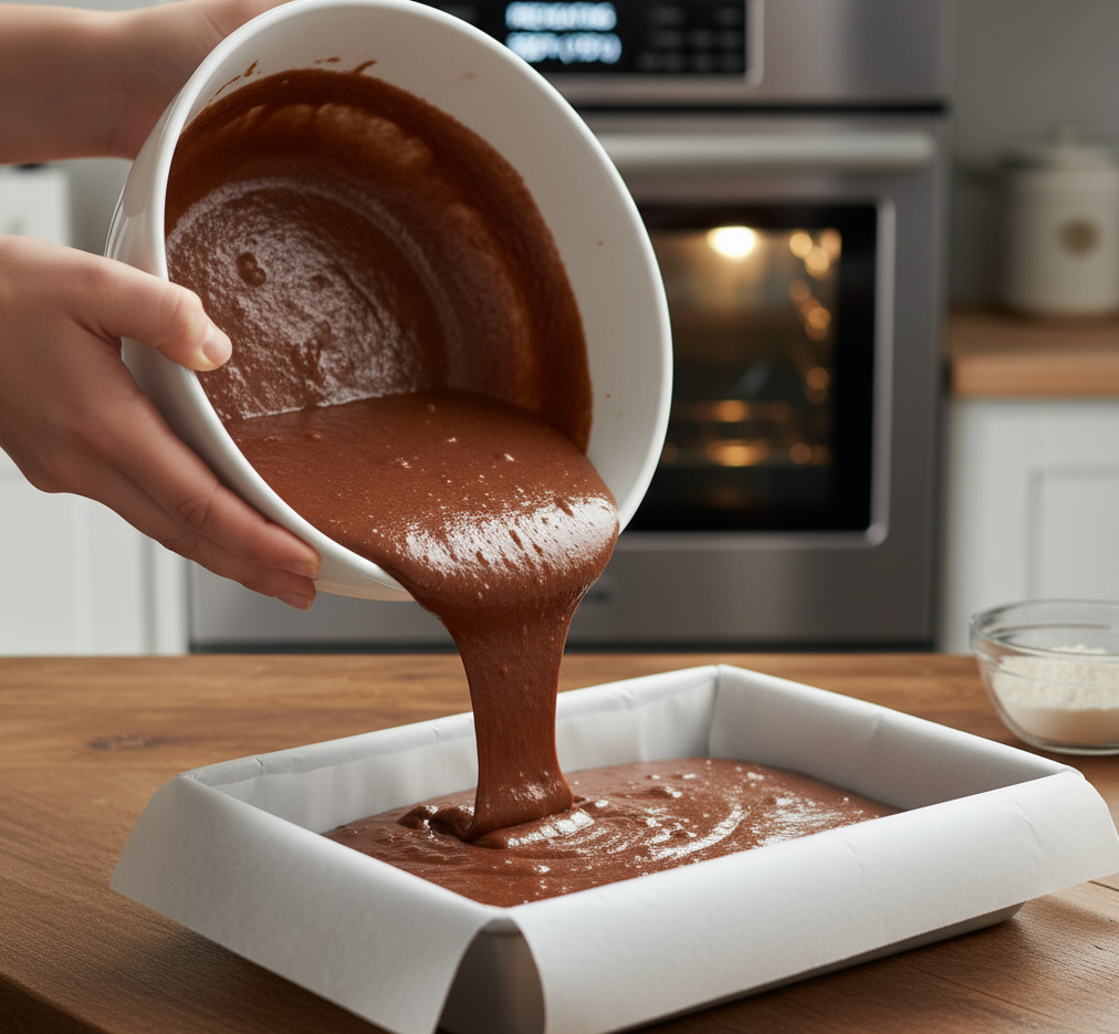 - Pour the batter into the prepared baking pan and smooth the surface.