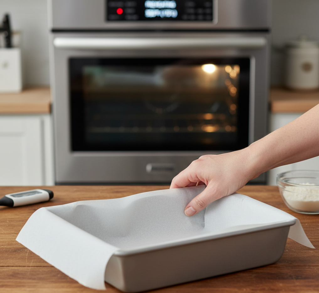 - Preheat the oven to 350°F (175°C) and line an 8×8-inch baking pan with parchment paper.