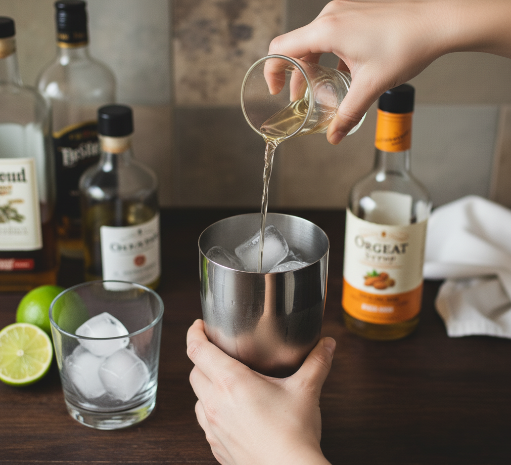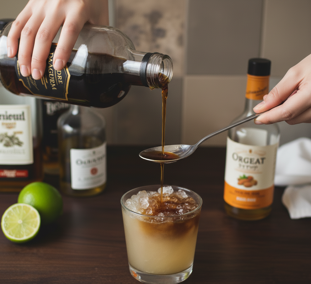 - Add white rum, lime juice, orange curaçao, and orgeat syrup.