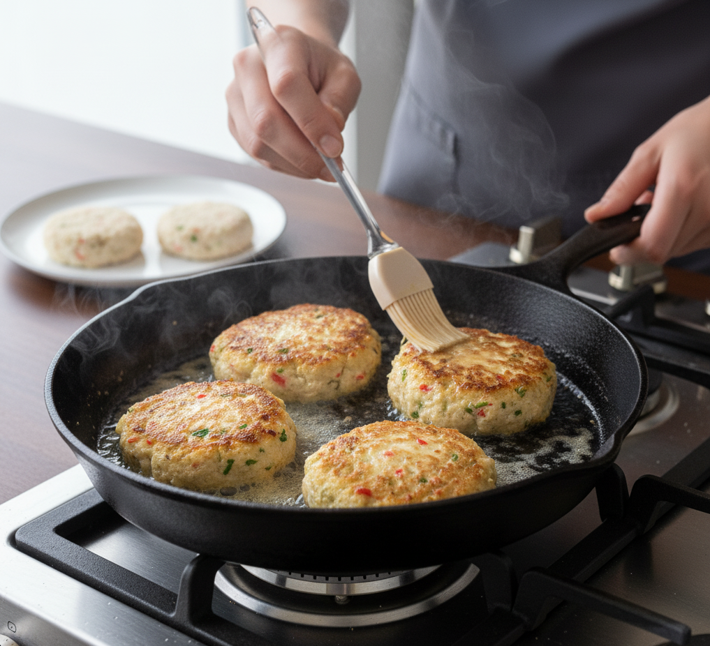 - Heat oil or butter in a skillet over medium heat. Cook the patties 3–4 minutes per side until golden brown. Brush lightly with additional butter or oil for extra crispiness.