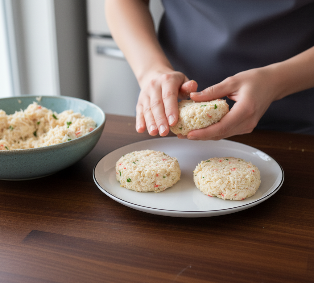 - Form Patties: Divide the mixture into 8 small or 4 large patties. Place on a plate and chill for 20–30 minutes to firm up. Chilling prevents the patties from falling apart during cooking.