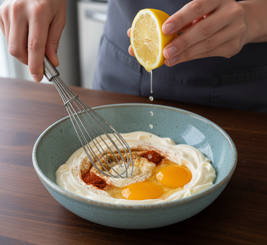 - In a bowl, whisk together egg, mayonnaise, Dijon mustard, and Old Bay seasoning. Add a splash of lemon juice for brightness.